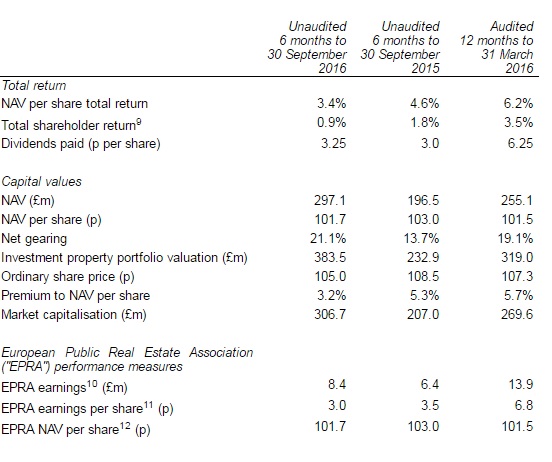 11 Earnings per share (“EPS”) excluding gains on investment properties. Basic EPS for the Period is 3.0p (30 September 2015: 4.3p, 31 March 2016: 5.5p).