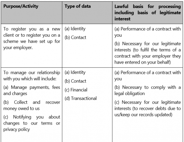 You may give us your Identity, Contact and Financial Data by filling in forms or by corresponding with us by post, phone and email or otherwise. Your employer may also give us your Identity, Contact and Financial Data where they are engaging our services on your behalf. For example, this includes personal data you provide when you (or, where appropriate, your employer on your behalf):